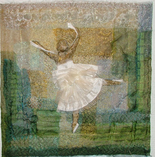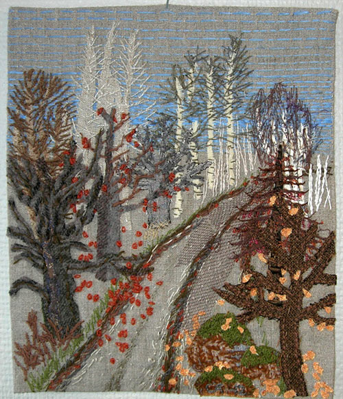 ”Jag har varit med i Broderiakademin några år och har funnit det otroligt stimulerande med detta fria broderi! I mitt yrke som sömmerska med egen ateljé blir det många små trådar och tygbitar över och de hamnar i mina verk. Jag broderar fritt från hjärtat. Jag har varit med på några samlingsutställningar och haft en separat utställning på Visingsö där mina pinnar också fick plats. Jag fick Broderiakademins Silvernål 2009.”
